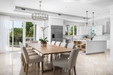 Enter through a landscaped drive and arrive at a beautifully proportioned residence where light-filled interiors blend classic sophistication with Caribbean comfort. Floor-to-ceiling glass and generous living spaces invite the turquoise waters and sea breezes into the heart of the home, with open-plan lounge, dining, and entertainment areas perfect for gathering with family or friends. Outdoor living is equally impressive: a heated infinity pool and hot tub frame the oceanfront terrace, while multiple alfresco dining and lounge areas capture sunsets and sea views throughout the day.